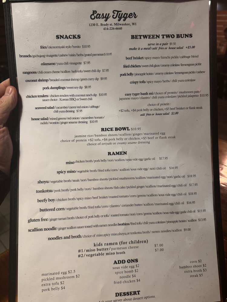 Welcome to Easy Tyger | An Asian Gastropub, a vibrant gem located at 1230 E Brady St, Milwaukee. This delightful ramen-focused eatery invites you to explore a menu inspired by various Asian flavors, enriched with global influences. The ambiance is welcoming, making it the perfect spot for a casual yet memorable dining experience.